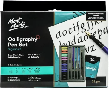 The Mont Marte Signature Calligraphy Pen Set of 31pc. This comprehensive set includes everything you need to master the art of calligraphy, featuring an array of pens, nibs, ink cartridges, and a practice pad. The high-quality pens provide smooth, consistent ink flow, making it easy to create beautiful lettering and intricate designs. Whether you are a beginner or an experienced calligrapher, this set offers versatility and precision for various styles and techniques. Packaged in a stylish case for easy storage and transport, this calligraphy set is perfect for personal use or as a thoughtful gift for art enthusiasts.